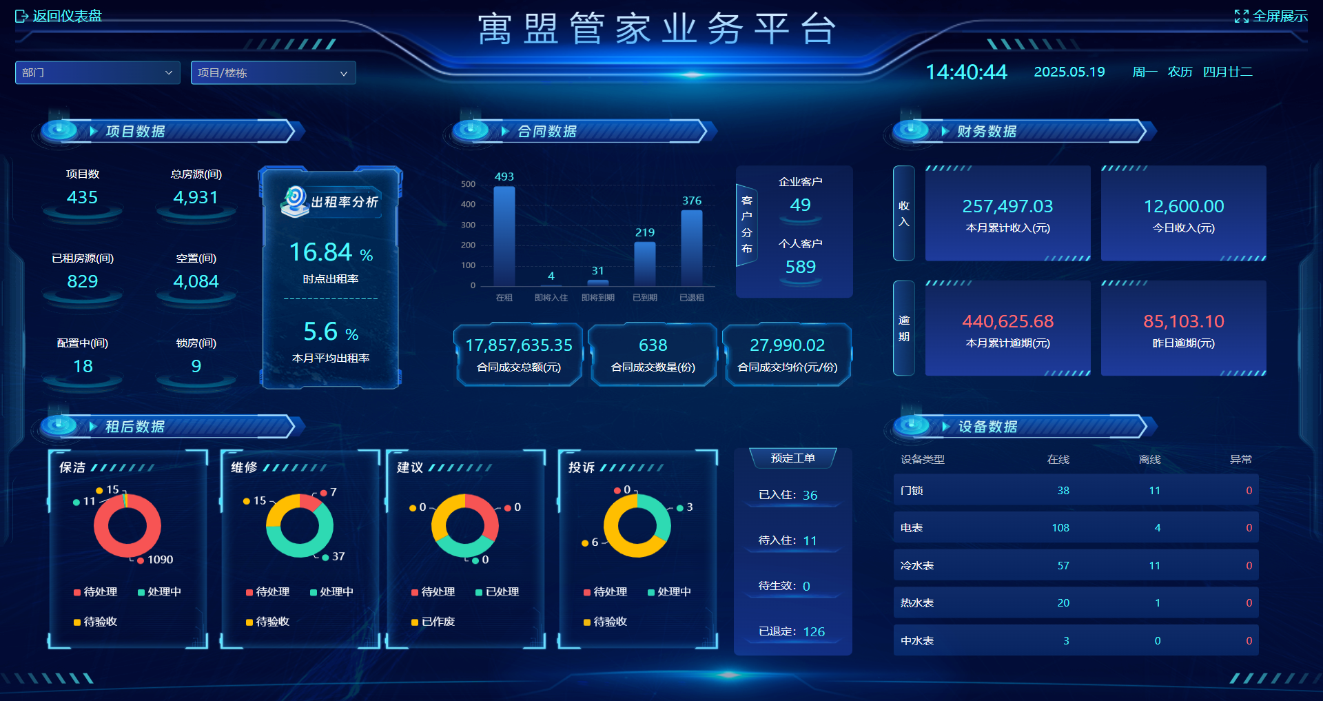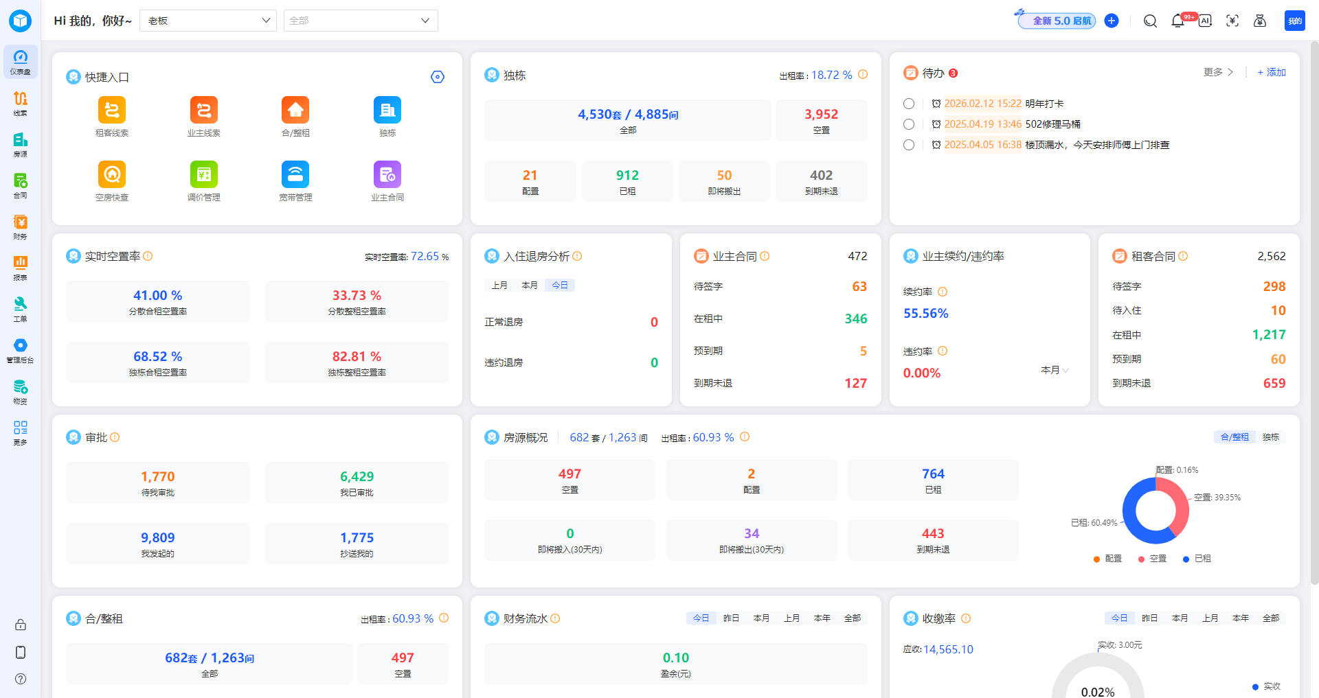 传统台账管理易出现信息滞后问题。寓盟管家系统构建了全域房源数据库,支持按区域、户型、建设年代等维度分类管理,每套房的面积、配套设施、维修记录等信息均可实时查询。系统首页的房源状态看板直观展示空置、在租、维修等状态占比,帮助管理人员快速掌握房源动态。